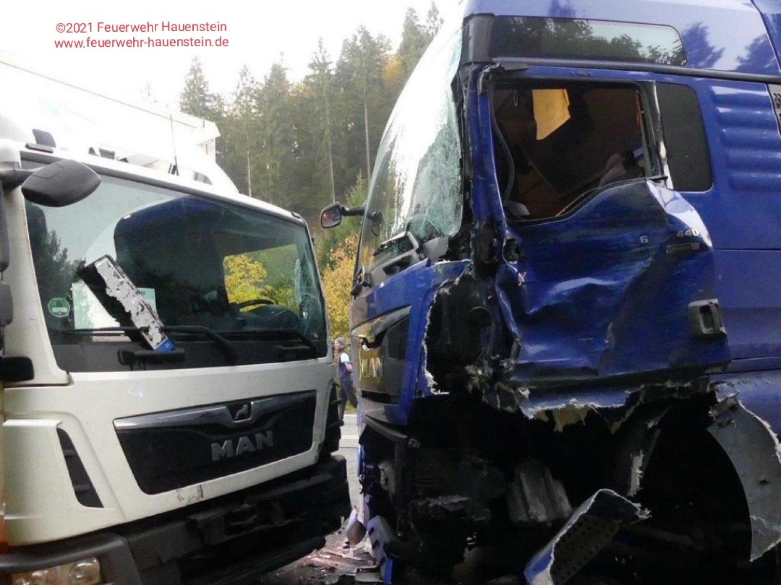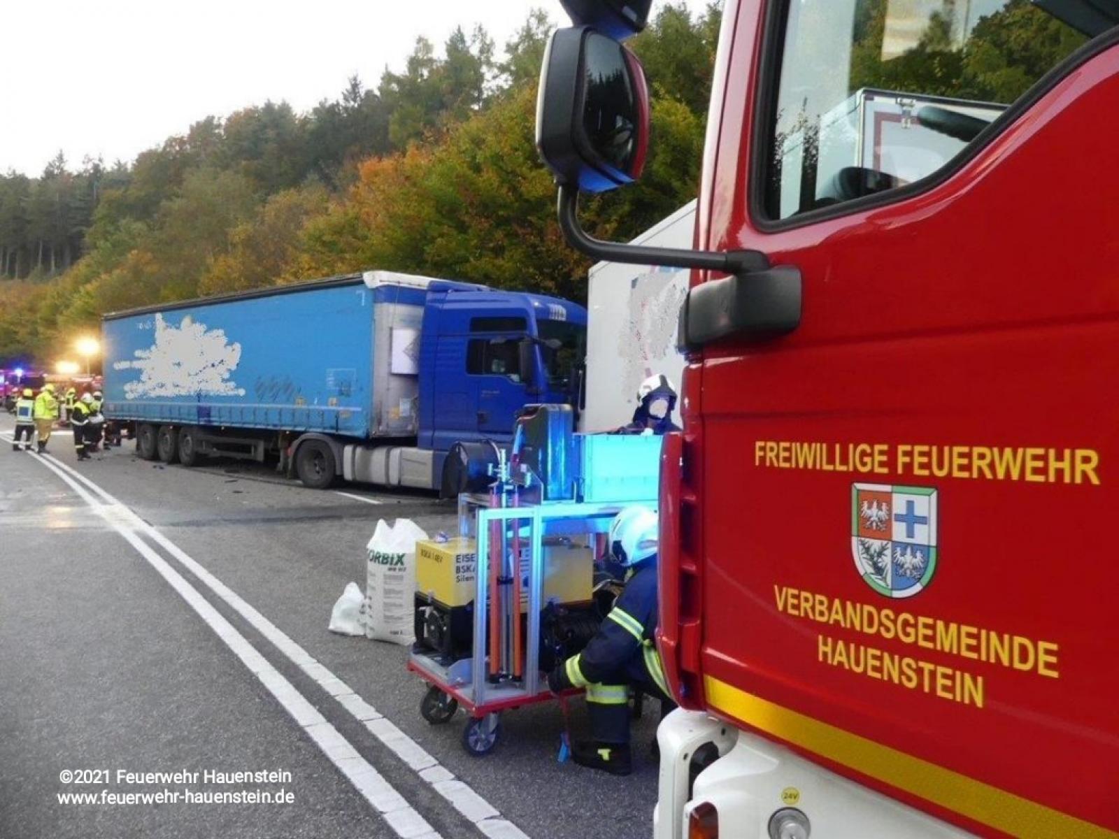 Verkehrsunfall zwischen drei LKW beim Eintreffen an der Einsatzstelle liefen aus einem Tank noch größere Mengen Diesel aus. Dieser wurde aufgefangen und schon ausgetretener Kraftstoff mit Bindemittel abgestreut, hier übernahm der Gefahrstoffzug später das Abpumpen des restlichen Diesel.