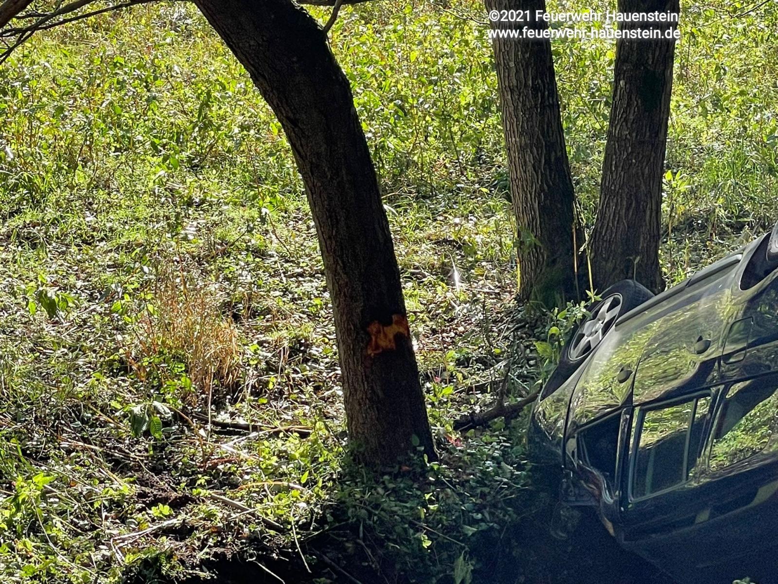 Bei einem Verkehrsunfall landete ein Fahrzeug Kopfüber in einem Bach.