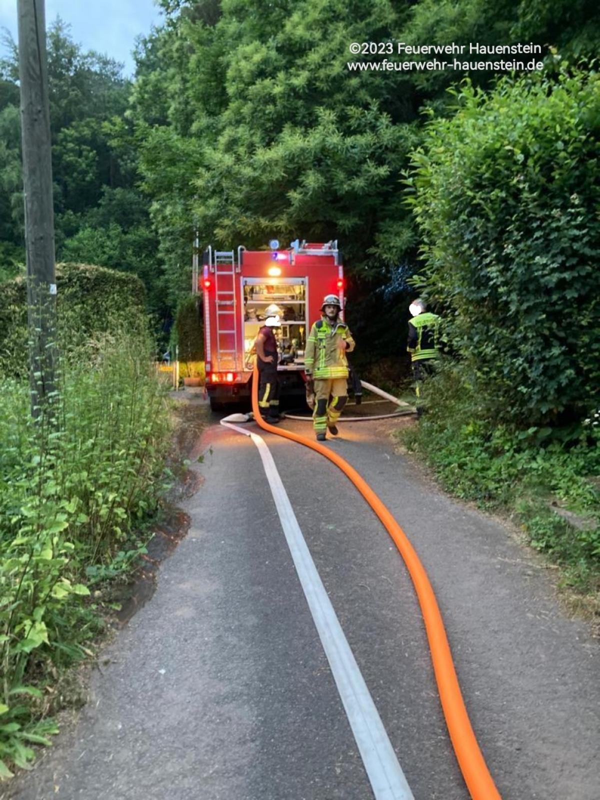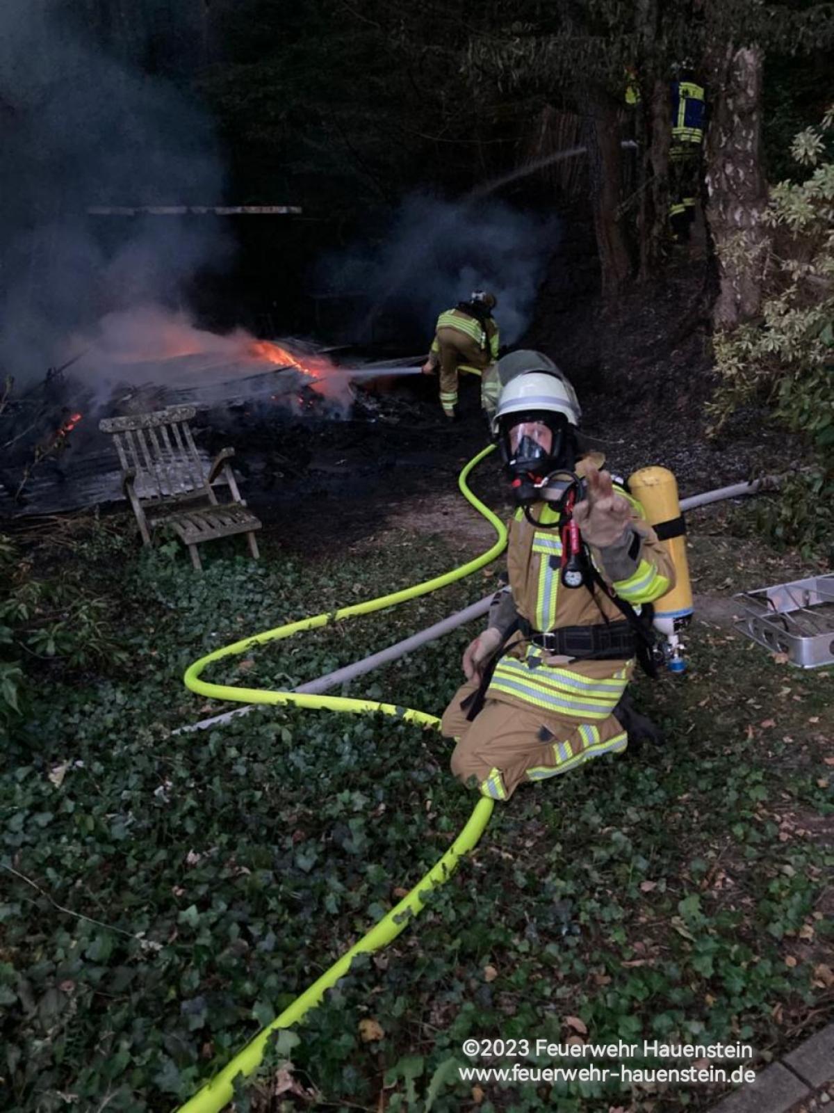 Beim Eintreffen der ersten Kräfte aus Lug brannte das Gartenhaus in voller Ausdehnung und das Feuer hatte bereits auf den Wald übergegriffen.