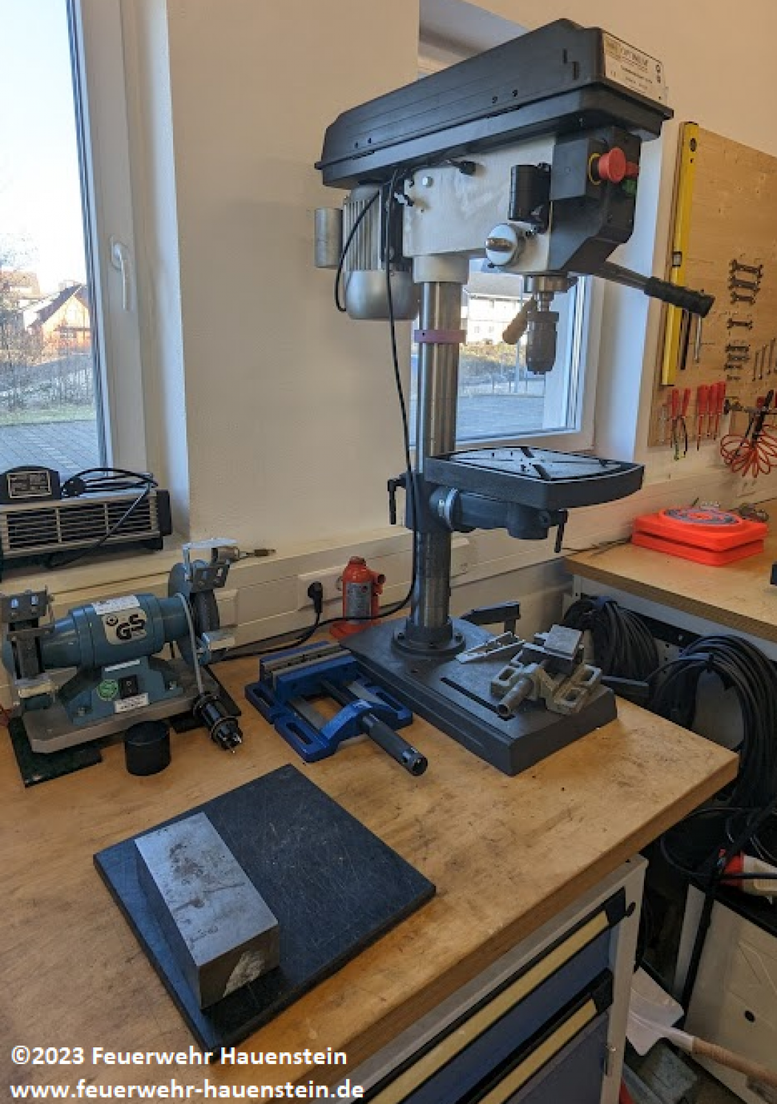 In der Werkstatt befindet sich Werkzeug zur Wartung unseres Fuhrparks. Außerdem lagern hier Messgeräte für die jährliche Überprüfung der elektrischen Betriebsmittel. Mit einer speziellen Vorrichtung an einer der Werkbänke können die Kupplungen neuer Schläuche eingebunden werden. Auch andere wasserführende Armaturen, sowie neu angeschaffte Geräte oder Maschinen werden hier geprüft, markiert und ggf. repariert.