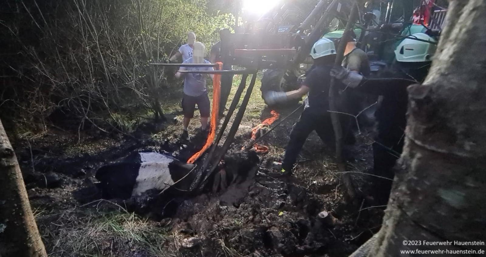Mit vereinten Kräften und Unterstützung eines Traktors mit Frontlader konnte das Tier aus der misslichen Lage befreit werden.