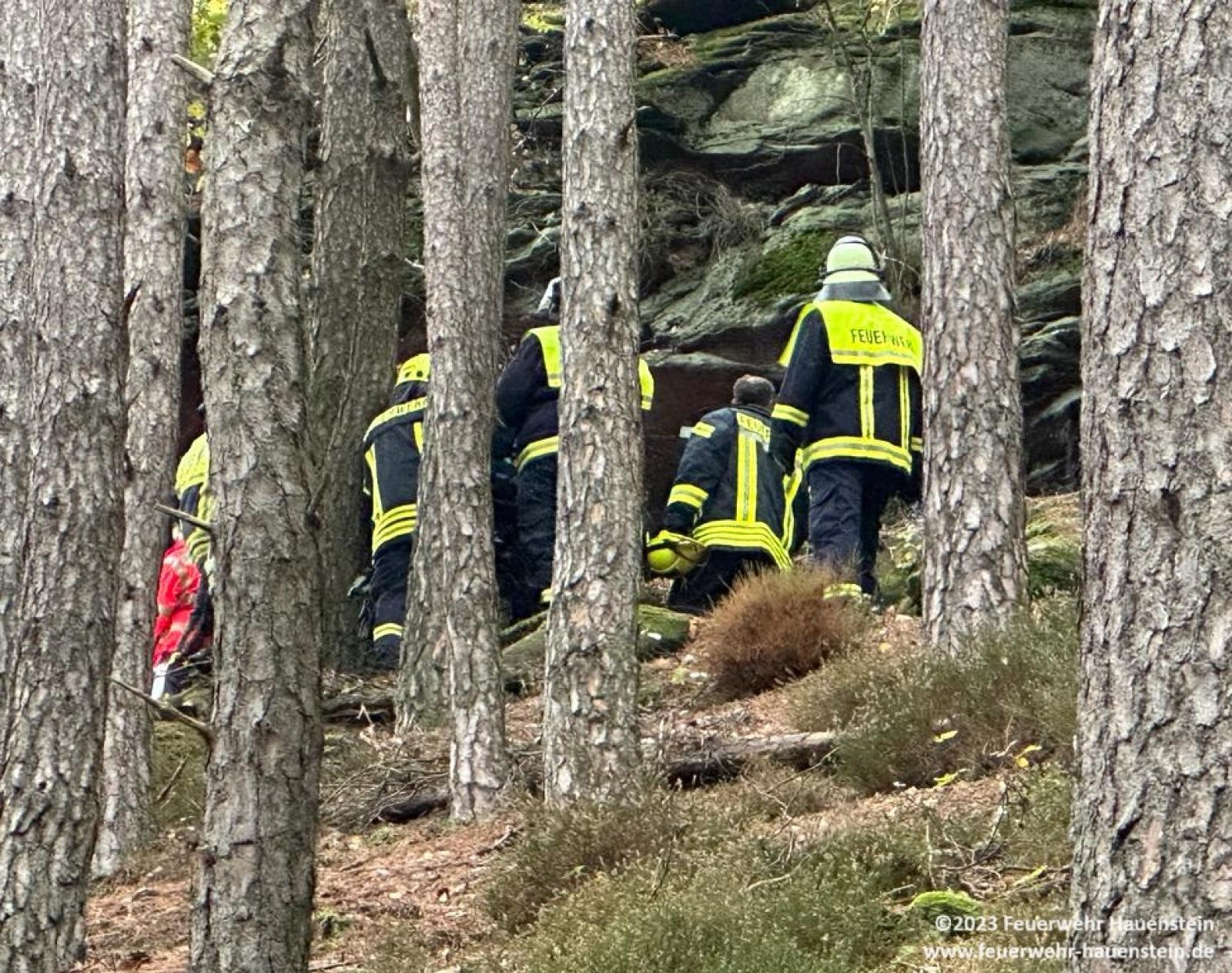 Die Feuerwehren aus Schwanheim, Darstein und Hauenstein unterstützen den Rettungsdienst im Bereich Hockerstein bei Schwanheim. Hier war eine Wanderin gestürzt und musste liegend über 500 Meter zum Rettungswagen transportiert werden, dabei wurden 60 Höhenmeter überwunden.