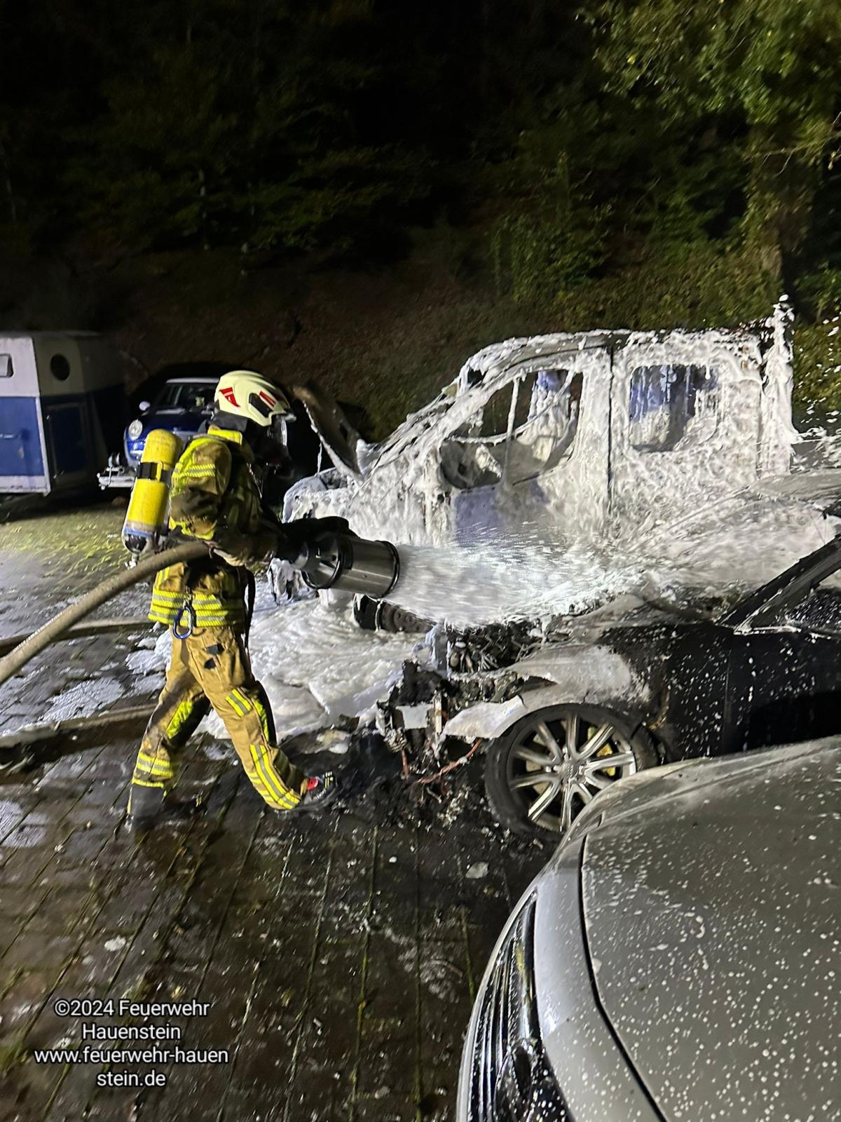 Bericht: Die Einheiten Hauenstein und Wilgartswiesen wurden zu einem PKW Brand innerhalb von Hauenstein alarmiert. Vor Ort brannten ein PKW und ein Kleintransporter in voller Ausdehnung. Ein weiterer daneben stehender PKW konnte geschützt werden.