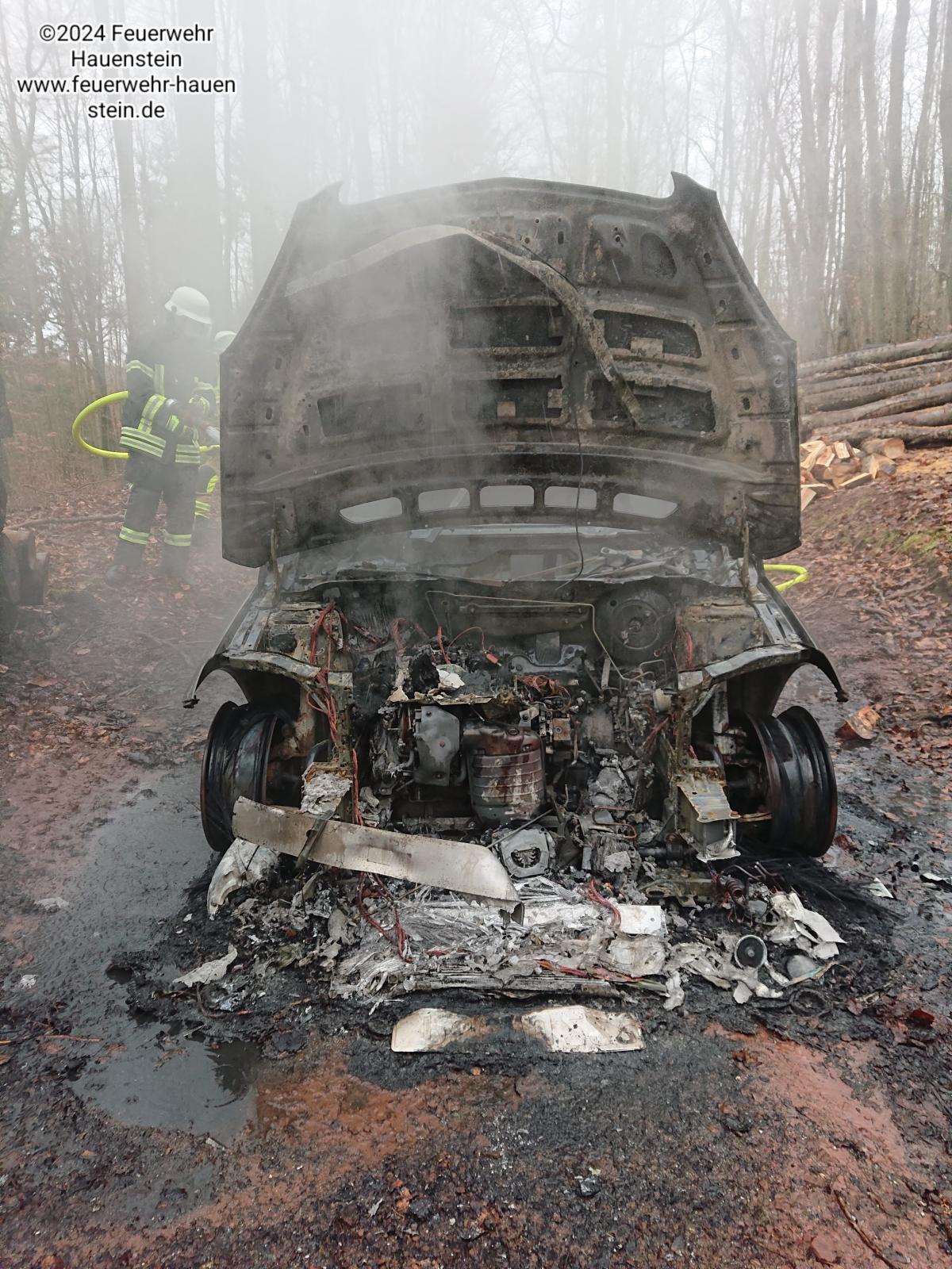 Bericht: Ein im Wald abgestellter PKW geriet aus technischen Gründen in Brand. Da die abgelegene Einsatzstelle schwer zu finden war stand das Fahrzeuge beim eintreffen in Vollbrand.