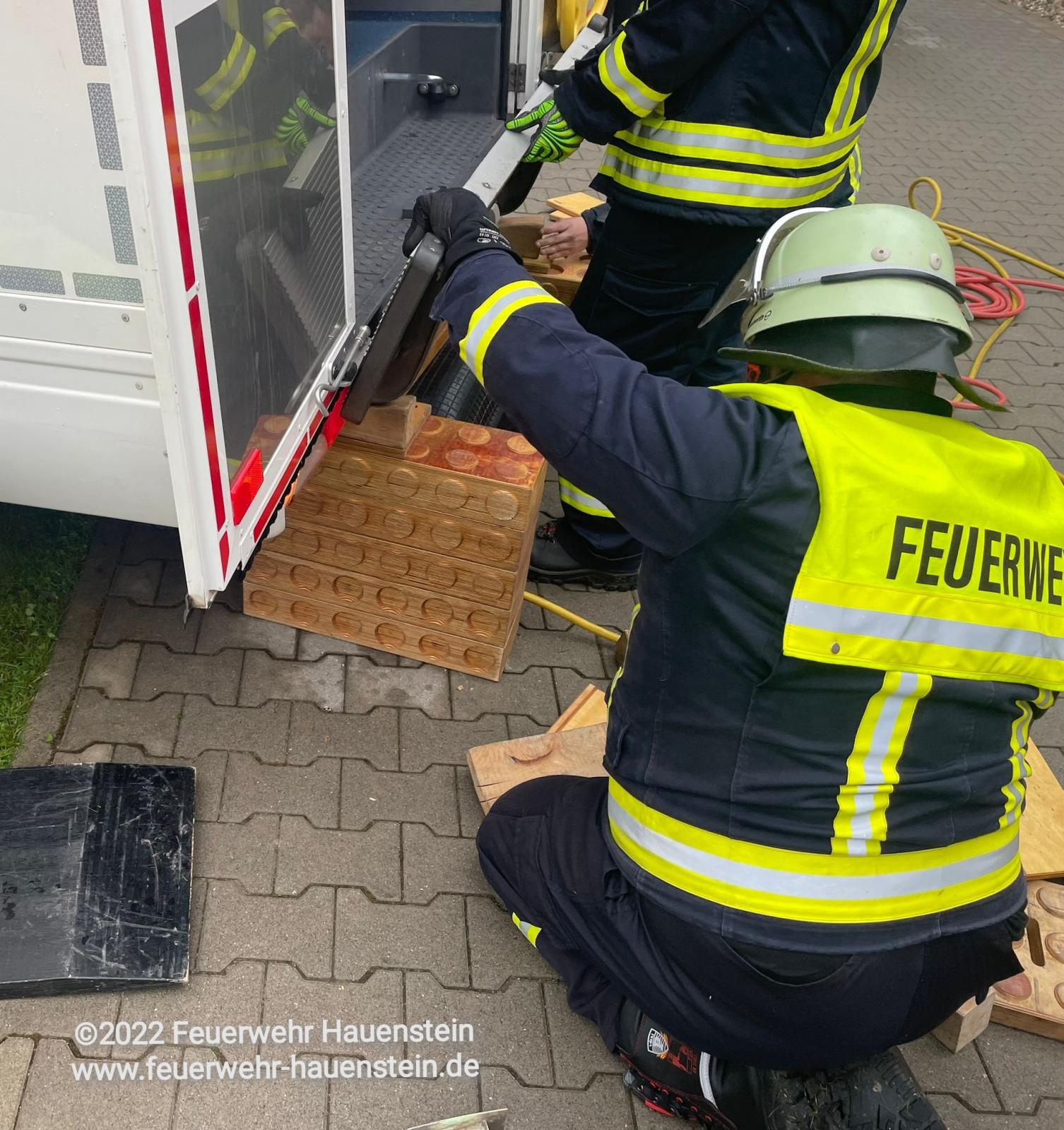 Bericht: Ein Rettungswagen hatte sich beim Wenden festgefahren. Um den Rettungswagen wieder aus dem aufgeweichten Rasen herauszufahren musste das Heck ca. 50 cm angehoben werden, um unter die Räder Auffahrbohlen schieben zu können. Das Fahrzeug konnte unbeschädigt wieder auf festem Boden abgestellt werden.