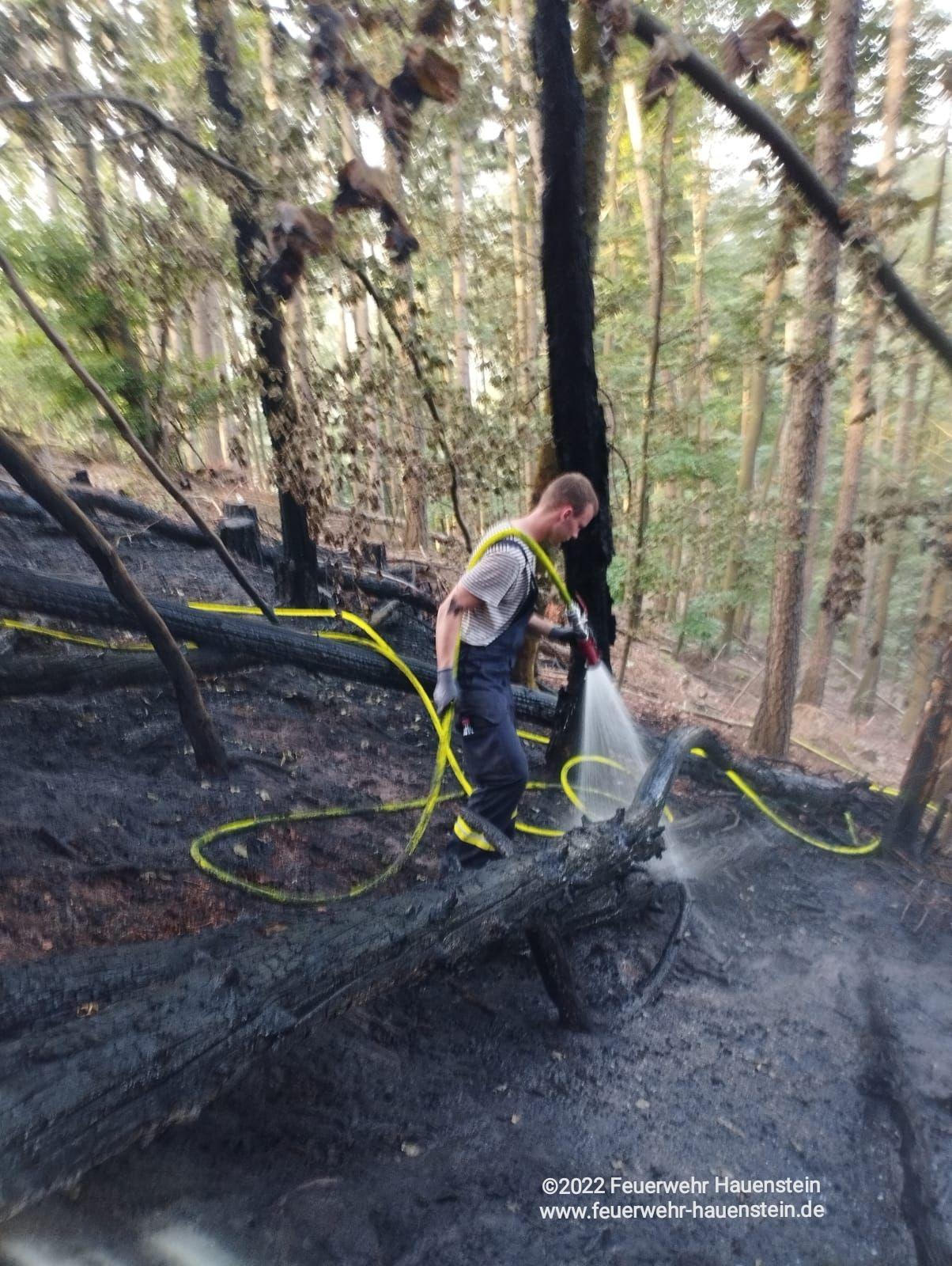 Zusammen mit Kräften aus Erfweiler und Dahn konnte mit mehreren Wasserrucksäcken, D-Leitungen und Handwerkzeugen eine weitere Ausbreitung gestoppt und anschließend eine Brandbekämpfung entlang beider Flanken nach unten eingeleitet werden.