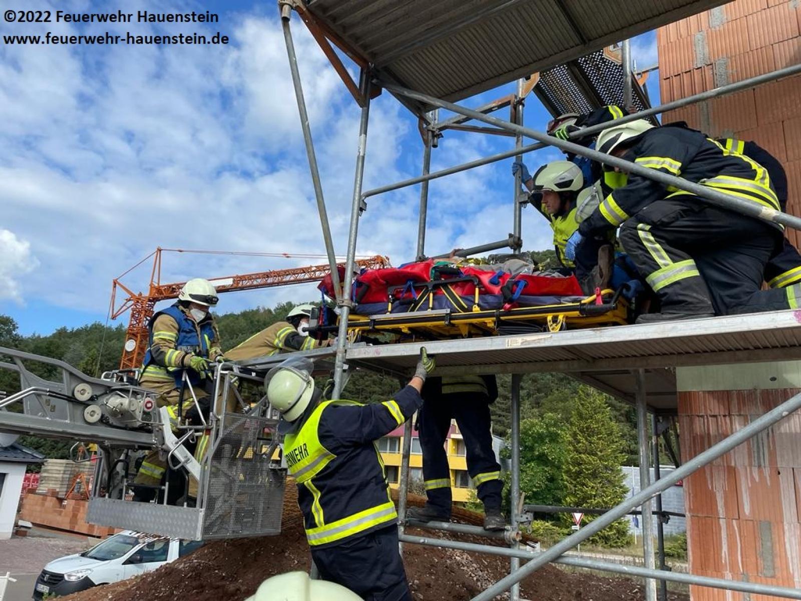 Bericht: Ein Bauarbeiter war durch ein Baugerüst gestürzt und blieb auf der darunter liegenden Ebene liegen. Nach der Demontage von Gerüstteilen konnte der Verletzte mit der Drehleiter aus Annweiler vom Gerüst gehoben und dem Rettungsdienst übergeben werden.