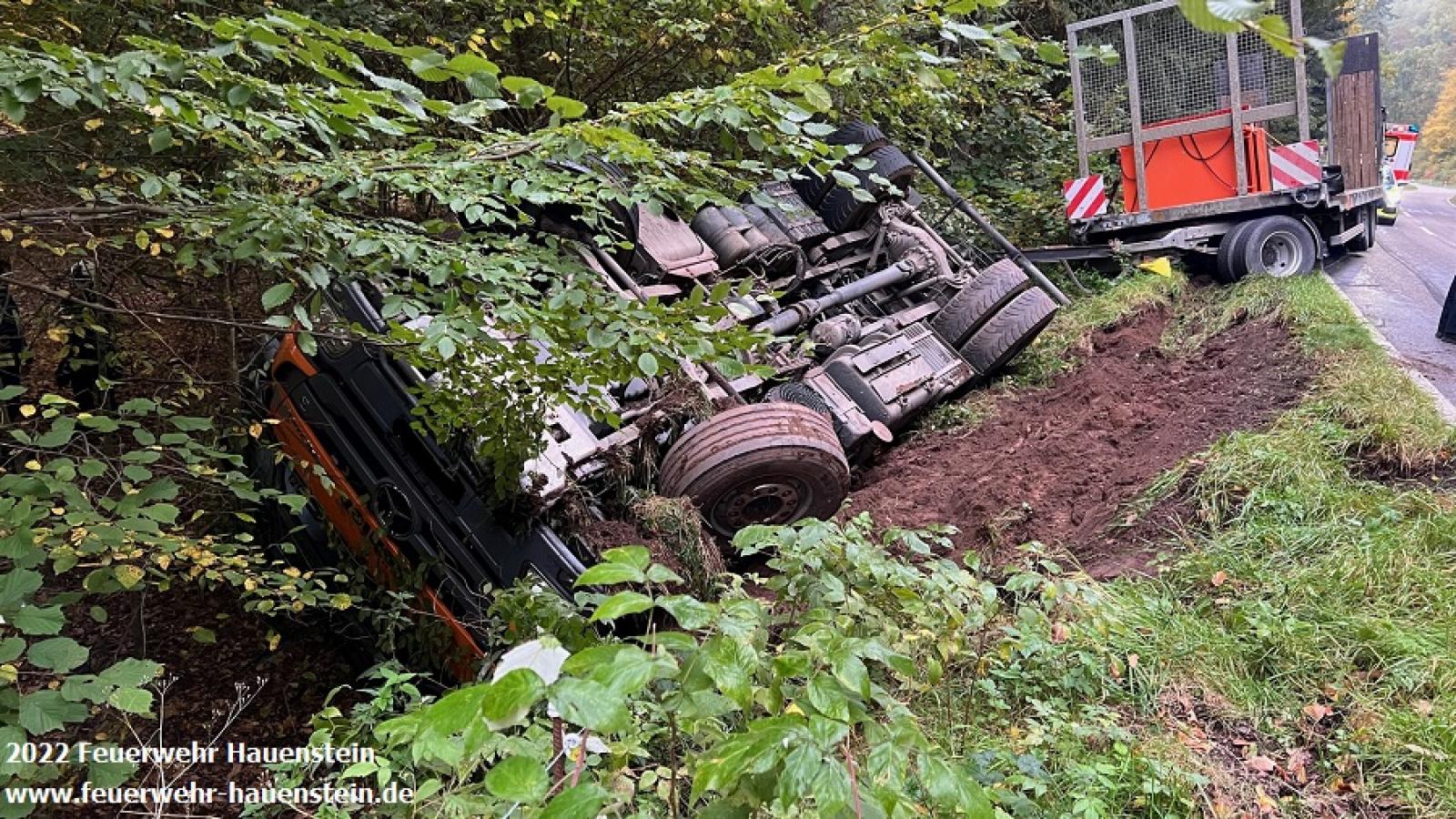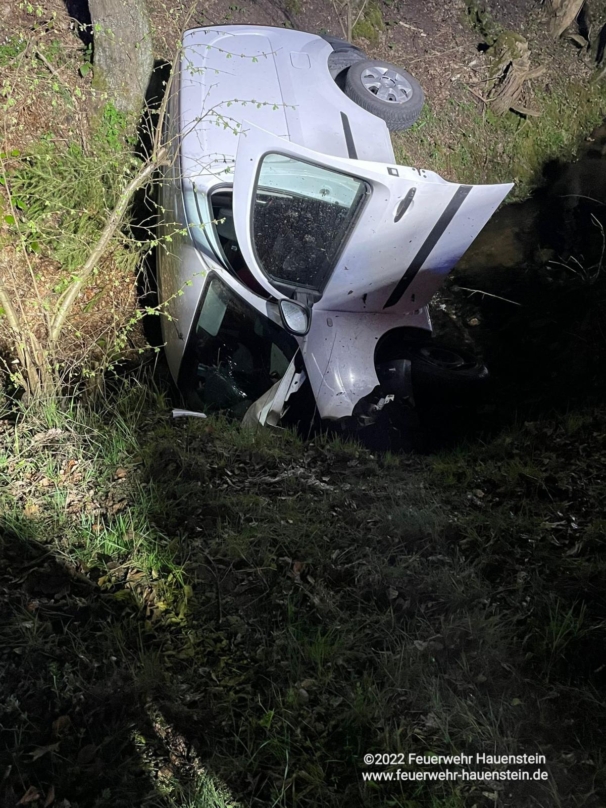 Bericht: Ein Kleintransporter kam von der Fahrbahn ab, kollidierte mit einem Durchlass und blieb auf der Seite im Hirtenbach liegen.