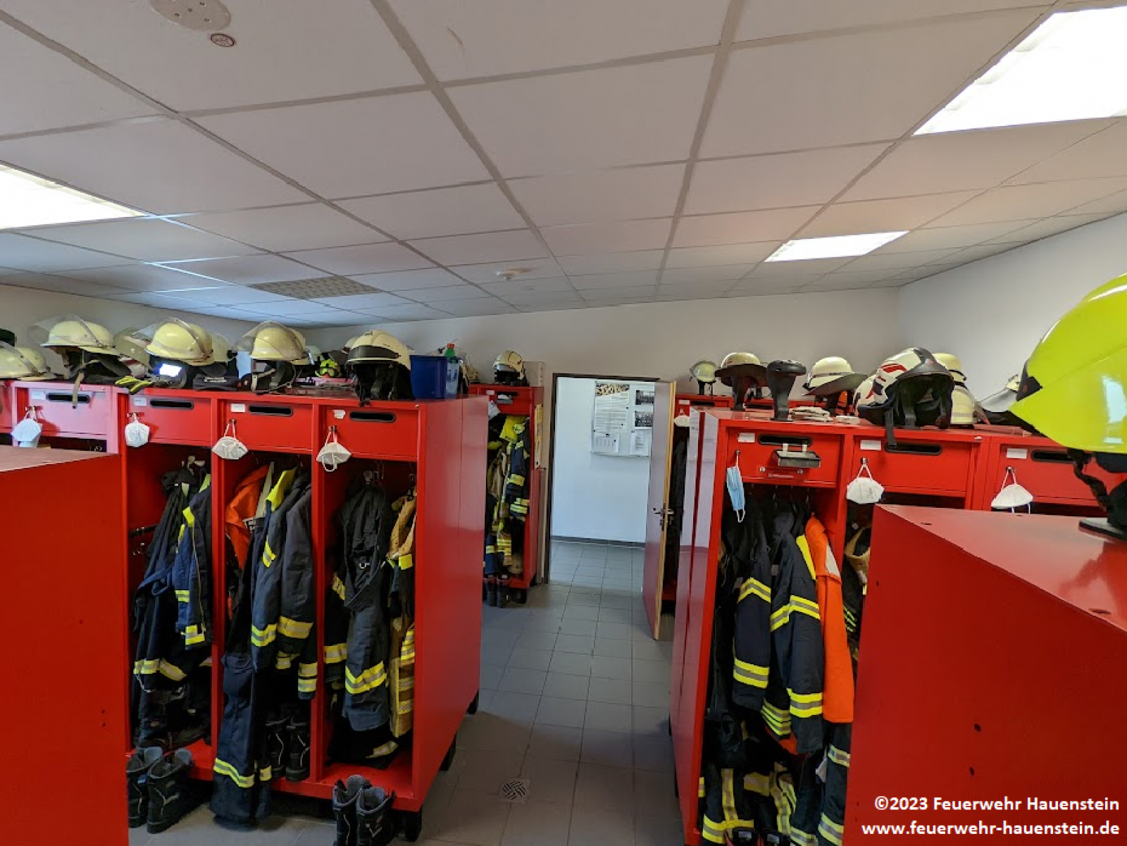 Die Umkleideräume für die Feuerwehrfrauen und -männer grenzen direkt an die Fahrzeughalle und liegen am Alarmeingang auf der Gebäuderückseite. Hier hängt die Einsatzkleidung der Feuerwehrleute, damit die teils kontaminierte Einsatzkleidung nicht privat gelagert werden muss. Außerdem bieten Sanitärräume eine Möglichkeit, um nach dem Einsatz im Gerätehaus zu duschen.
