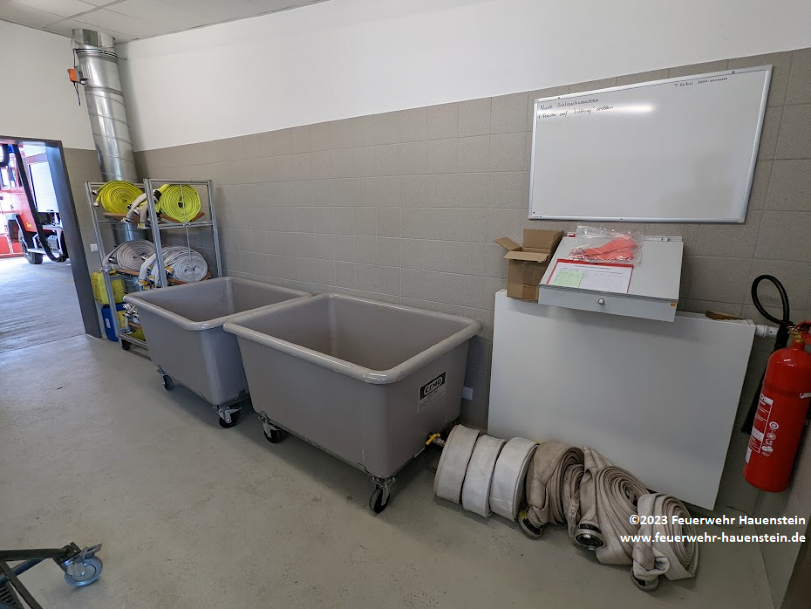 Die Schlauchwasch- und Schlauchpflegeanlage ist aufgrund der entstehenden Feuchtigkeit in einem separaten Raum untergebracht. Auch hier kümmern sich Kameraden mit einer speziellen Fortbildung um die Pflege des Schlauchmaterials.