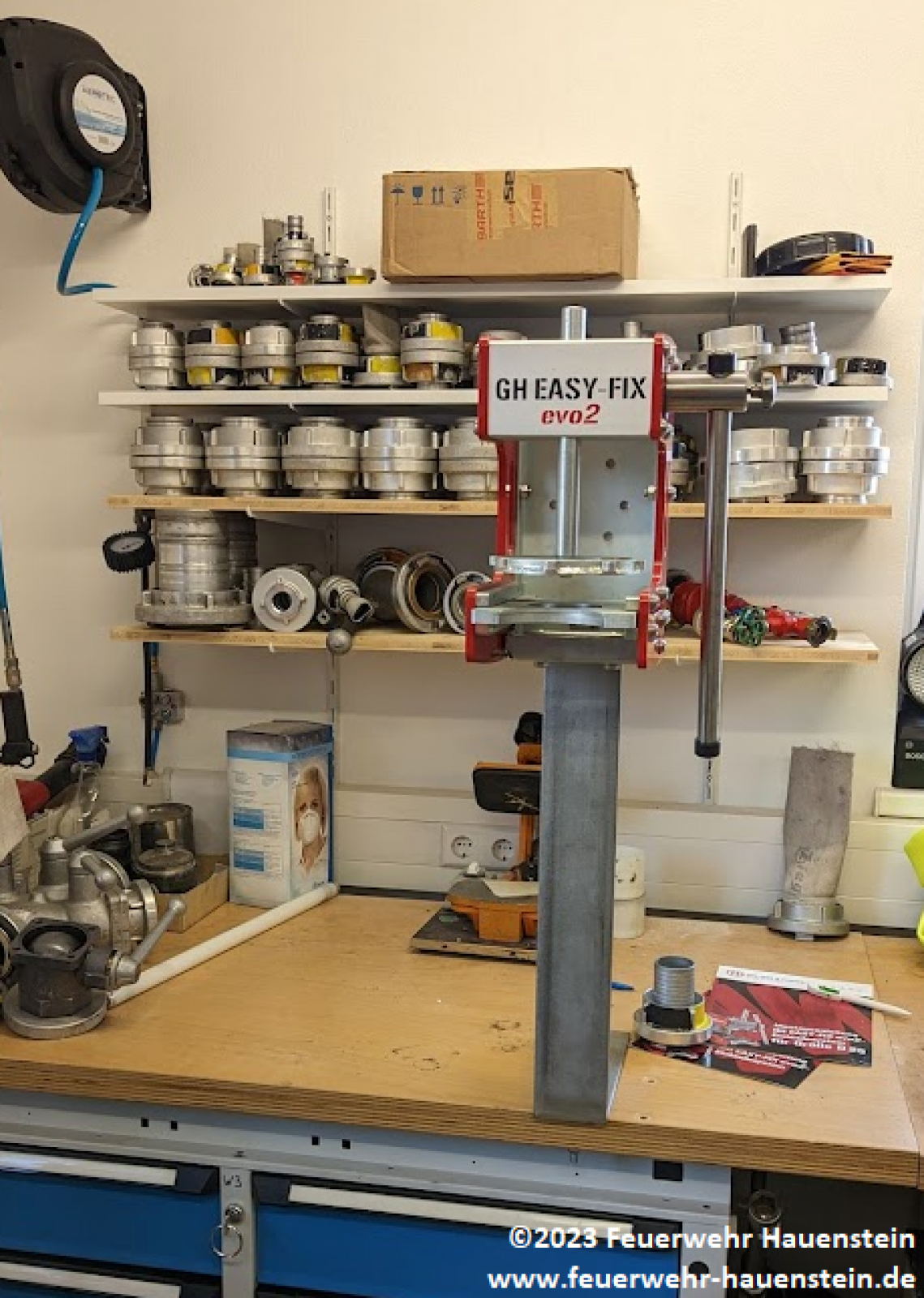 In der Werkstatt befindet sich Werkzeug zur Wartung unseres Fuhrparks. Außerdem lagern hier Messgeräte für die jährliche Überprüfung der elektrischen Betriebsmittel. Mit einer speziellen Vorrichtung an einer der Werkbänke können die Kupplungen neuer Schläuche eingebunden werden. Auch andere wasserführende Armaturen, sowie neu angeschaffte Geräte oder Maschinen werden hier geprüft, markiert und ggf. repariert.
