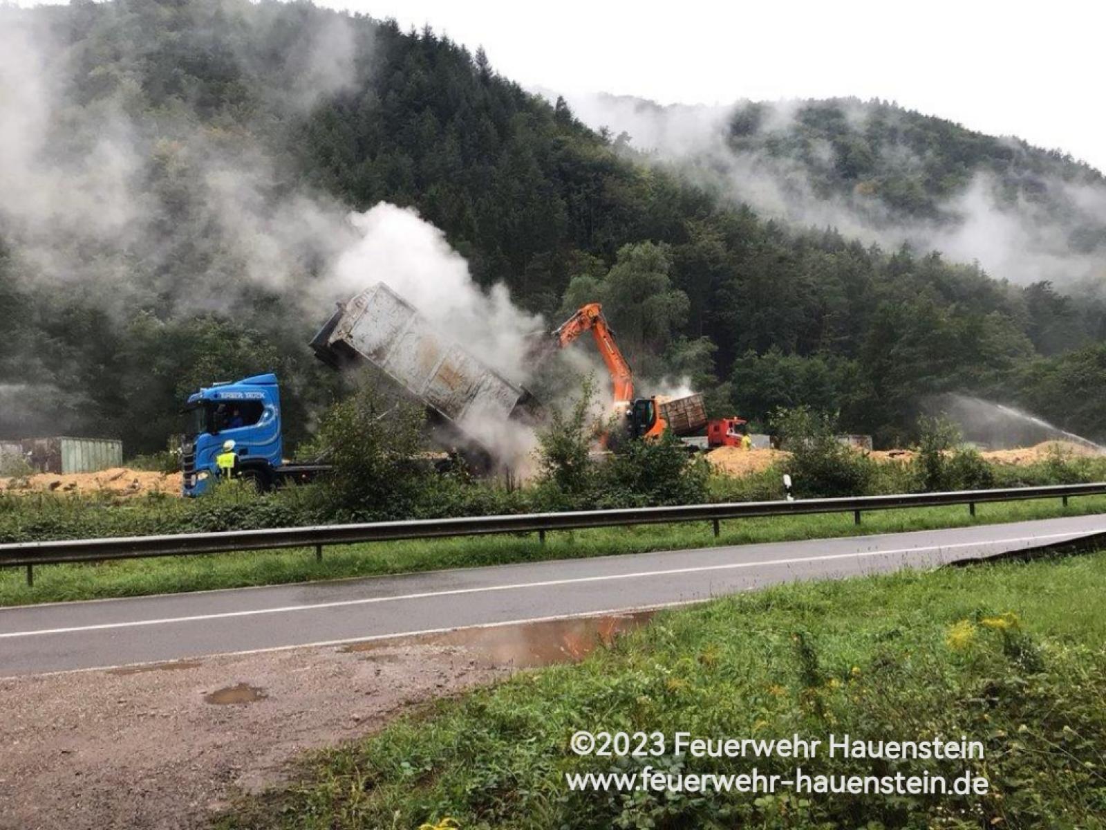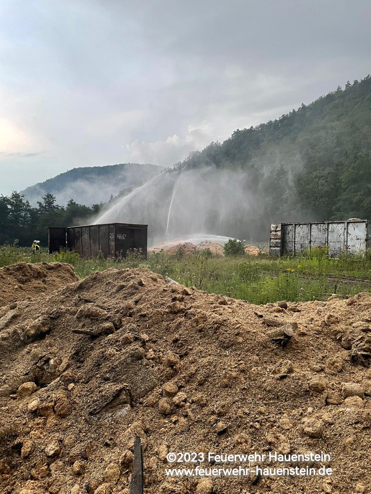 Aufgrund der Menge von anfangs geschätzten ca. 30 Lkw Ladungen Sägespänen bzw. Holzbrikkets entschied man sich dazu die in Hauenstein vorhandenen Kreisregner um die Fläche zu Positionieren um das Brandgut Kontinuierlich mit Wasser zu beaufschlagen.
