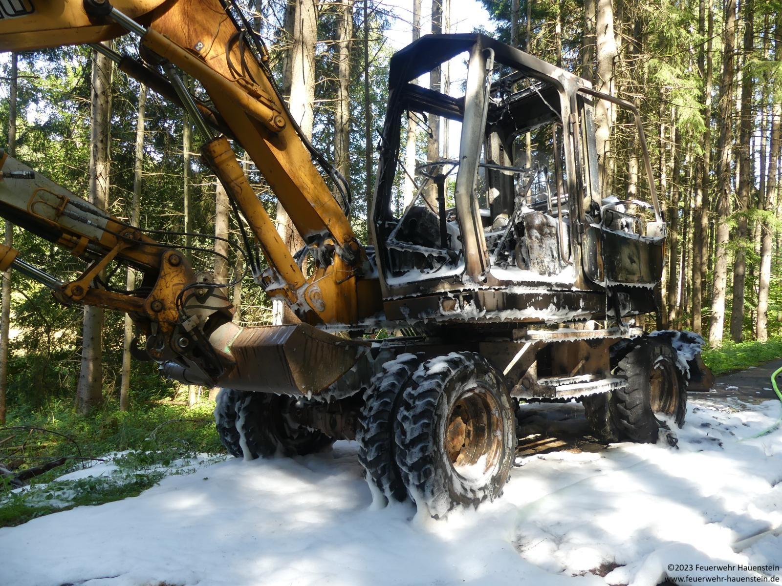 Ein Radbagger war außerorts auf einem Radweg in Brand geraten und stand beim Eintreffen der Einsatzkräfte in Vollbrand. Zwei Atemschutztrupps aus Hinterweidenthal und Hauenstein bekämpften den Brand im Heck des Fahrzeugs und verhinderten durch Schaummittel ein erneutes Aufflammen. Anschließend wurden auslaufende Betriebsmittel aufgefangen und Ölbindemittel zum Schutz der Umwelt ausgebracht. Ein Abschleppunternehmen transportierte den defekten Bagger auf einem Tieflader von der Einsatzstelle ab.