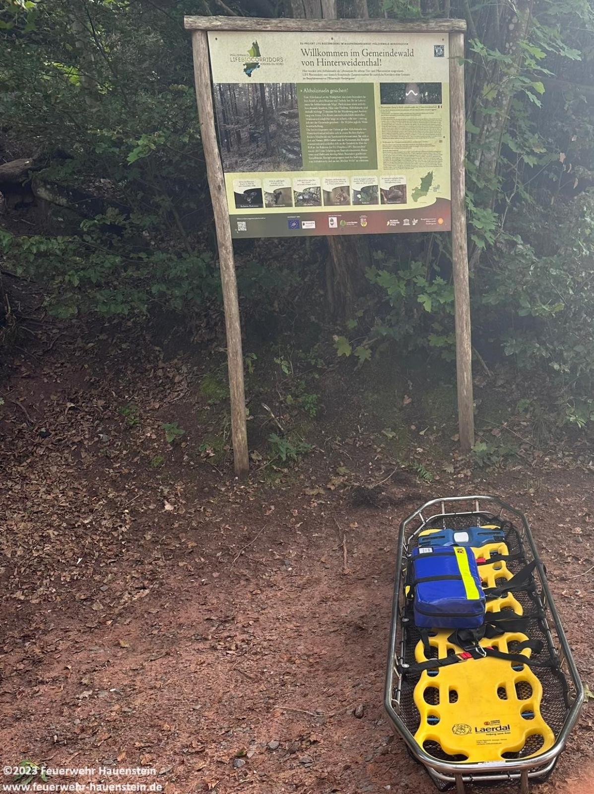 Eine Wanderin war auf einem Waldweg nahe des Teufelstischs gestürzt und musste vom Rettungsdienst behandelt werden. Die Feuerwehr unterstützte mittels Schleifkorbtrage beim Transport zum Rettungswagen.